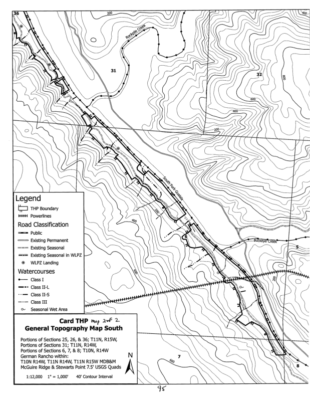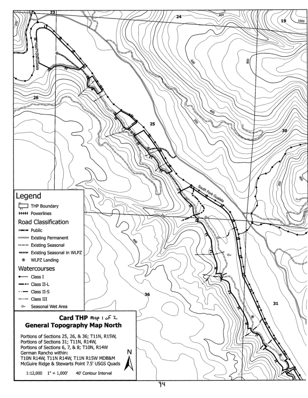 Card THP Section 2 – [14 MB, 102 pages] Operations: Silviculture, yarding, erosion hazard rating, winter operations, roads & landings, watercourse & lake protections, alternative watercourse & lake protections (in lieu of standard rules), biological resources, maps.